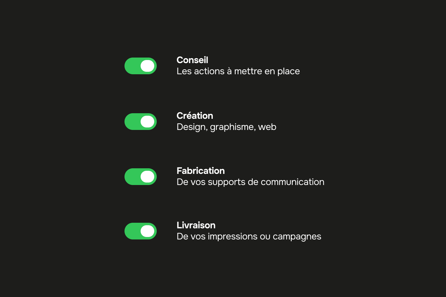 Identité, web, pub, signalétique : on gère tout de A à Z. Plus besoin de jongler avec 5 prestataires. Nos équipes déploient vos campagnes en un temps record pendant que vous restez concentré sur vos clients.
